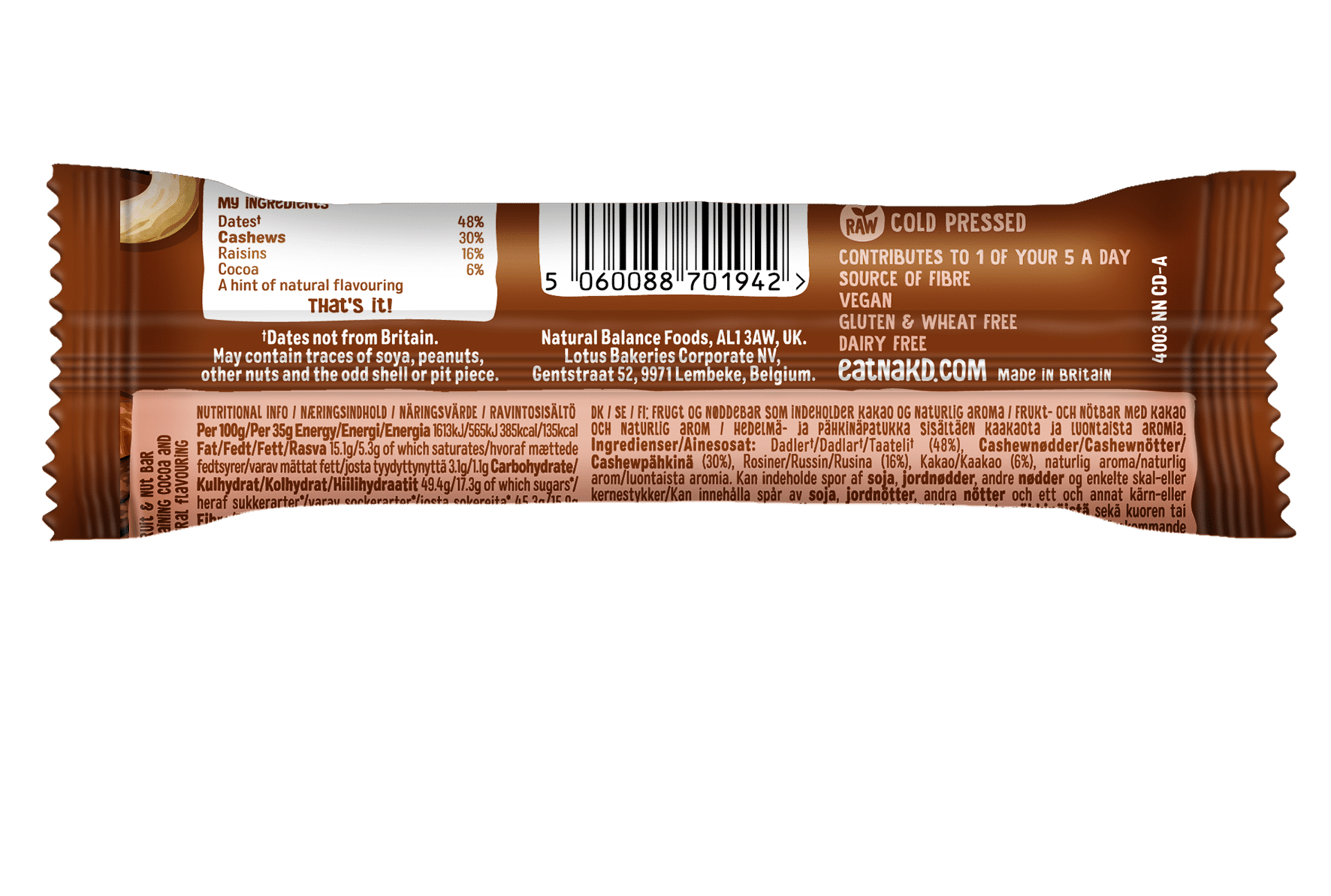 مكونات ناكد بروتين بار تمر وكاكاو مالتي باك: