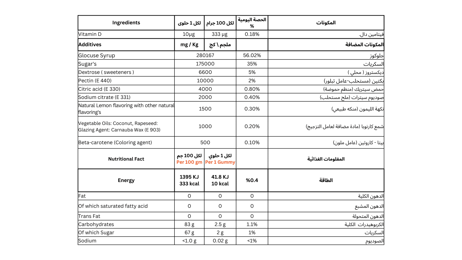 شراب الجلوكوز، سكر، دكستروز، عامل التبلور: البكتين، فيتامين د (كوليكالسيفيرول)، الحمض: حامض الستريك، منظم الحموضة: سيترات الصوديوم، نكهة الليمون الطبيعية مع نكهات طبيعية أخرى، زيت نباتي (النخيل)، عامل التزجيج: شمع الكرنوبا، لون: بيتا كاروتين.